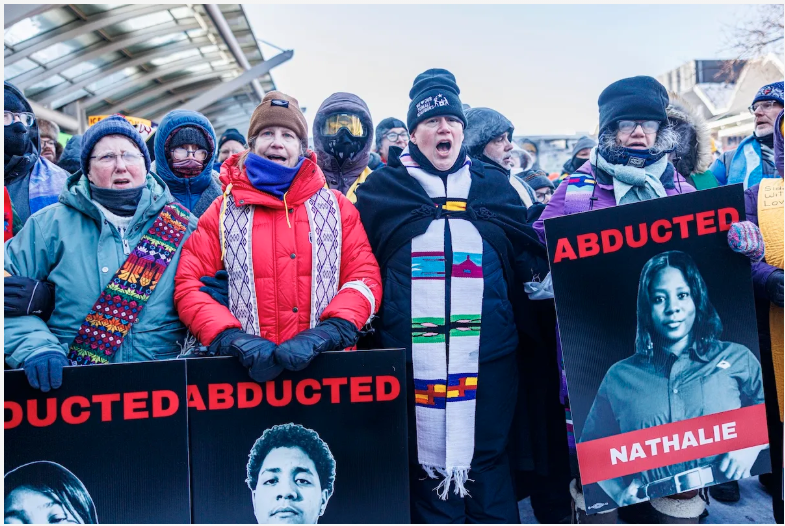 Dean Katherine Lewis (wearing red parka) marches with other clergy during an interfaith protest at Minneapolis-St. Paul International Airport on Jan. 23. The protest was part of a larger "ICE Out of Minnesota" day of action opposing federal immigration authorities' operations in the state and demanding accountability for federal agents who harmed residents. Photo by Kerem Yucel for Minnesota Public Radio ©2026. Used with permission. All rights reserved.